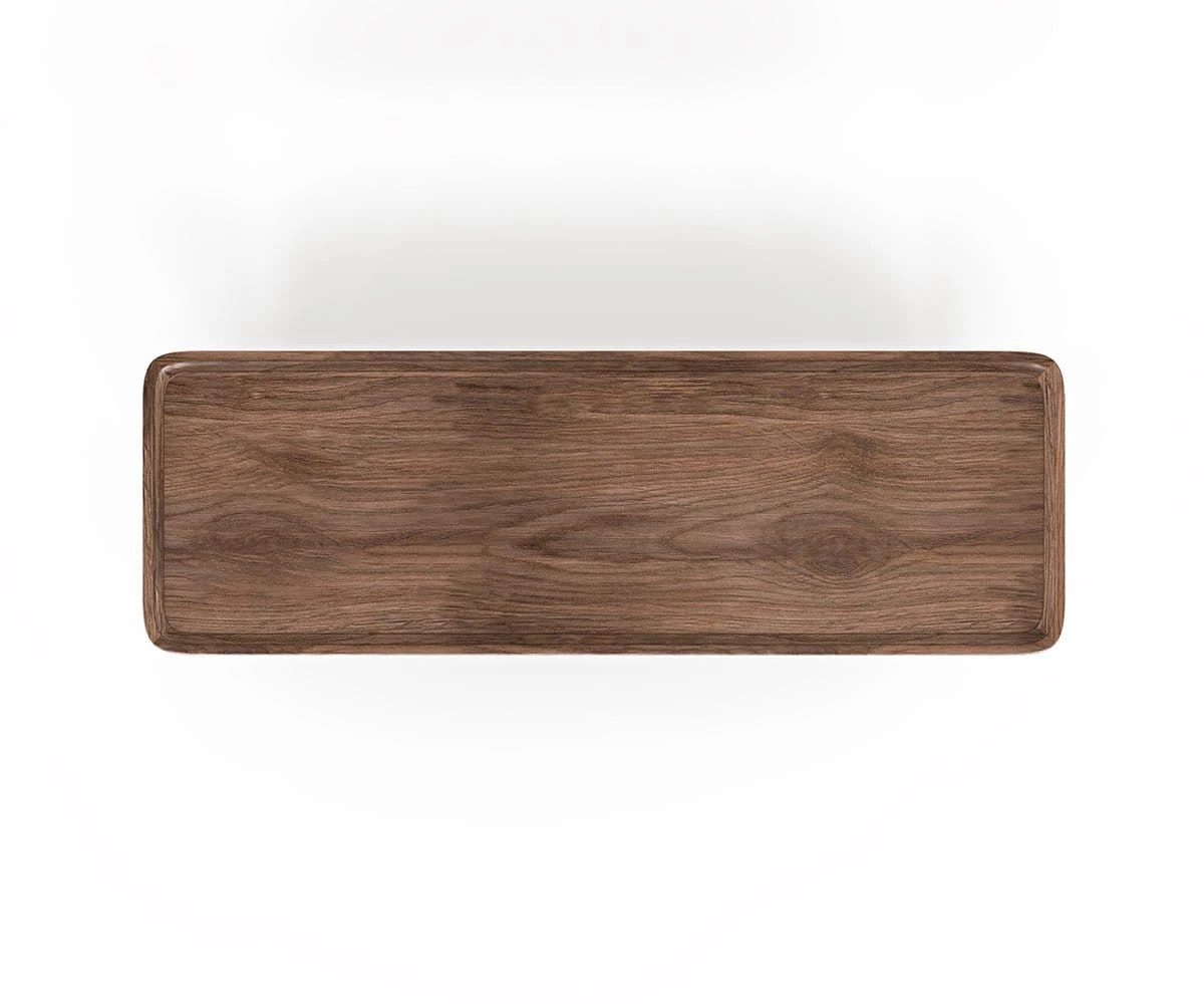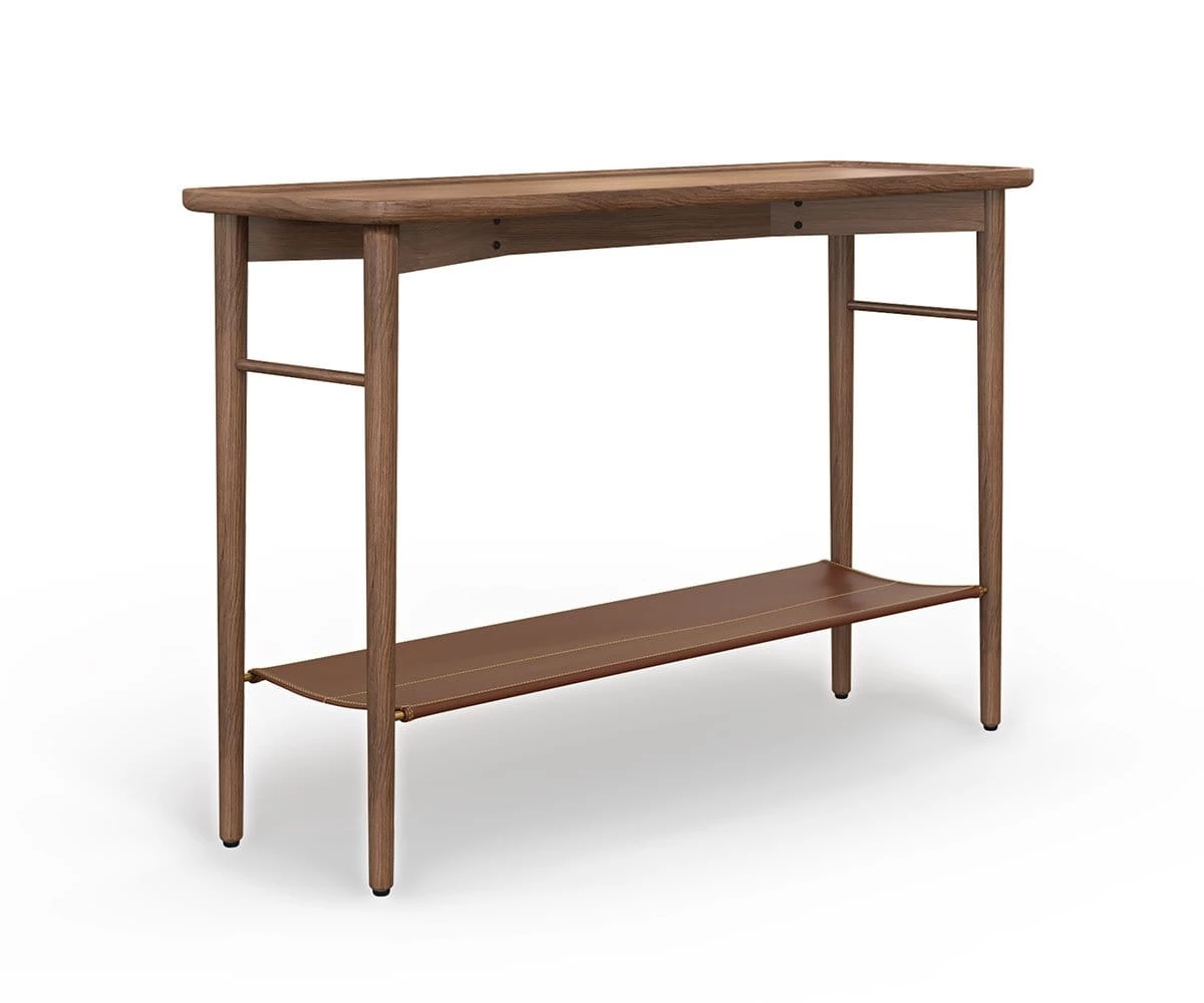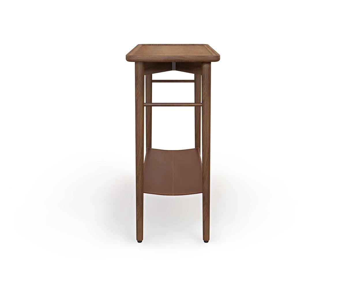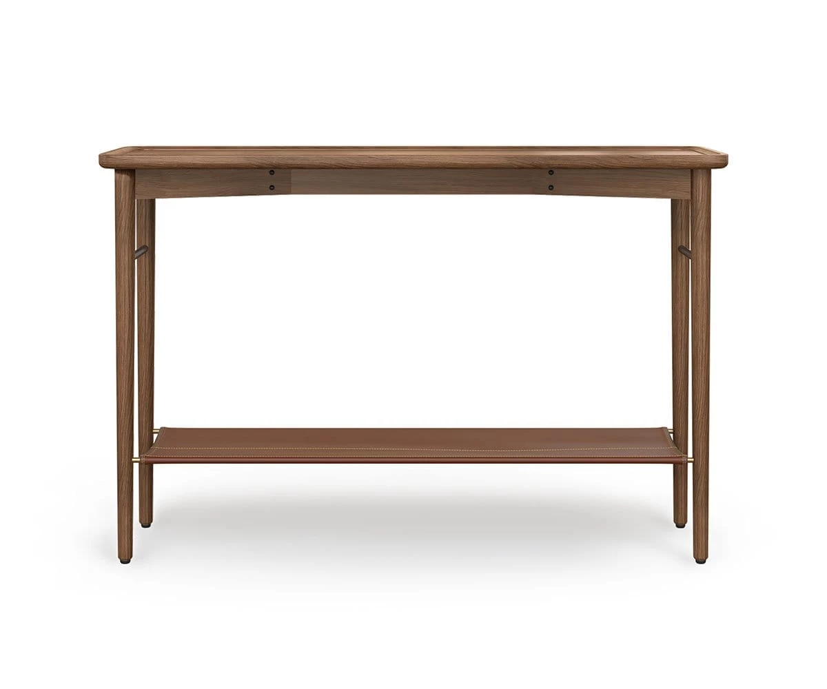 Wood and leather come together to create a table that suggests rustic, contemporary themes. The Haron Console Table features a convenient leather shelf stretched between brass bars, and a smooth surface ideal for featuring carefully selected items chosen for display.