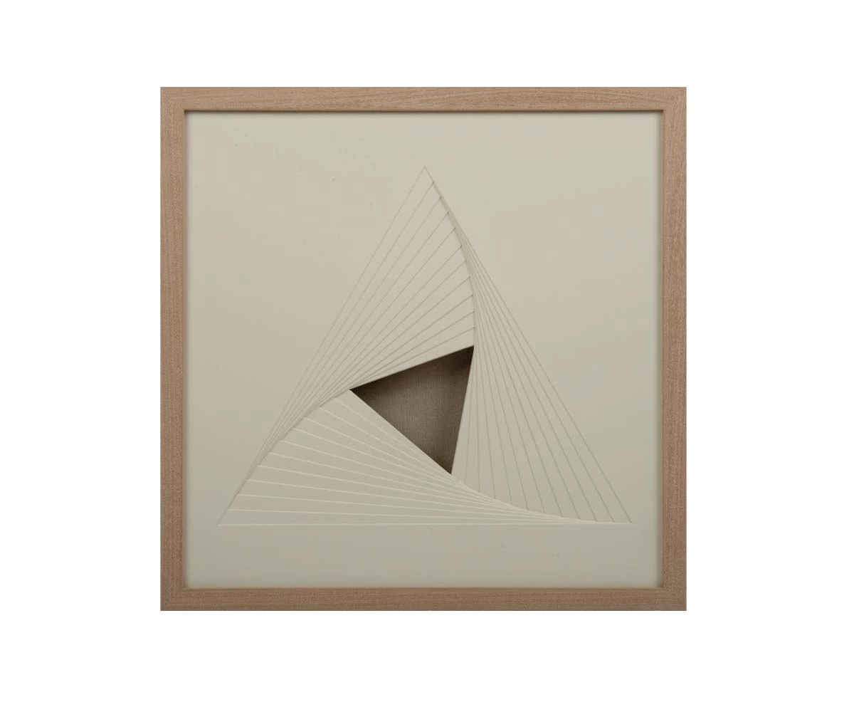 Layered Tranquility Wall Art reveals hidden depths as the viewer looks more closely. Carefully crafted, this work showcases multiple cream-colored pages in soothing hues that blend well with the neutral-toned wooden frame. Set within the borders of a multidimensional triangle, this piece features layers of paper designed to give a sense of an artistic ebb and flow.Β Layered ReflectionΒ and Layered SymmetryΒ each sold separately.