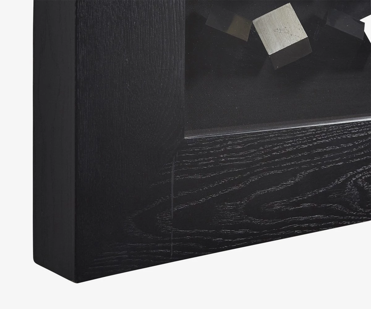 Cubist-inspired design meets an energetic modern aesthetic in the Paxtown Graphic. This decorative piece features a thick black frame surrounding rows of cubes that seem to dance in hues of satiny gold, silver, and inky black. Add this piece to your collection and enjoy the multi-dimensional charisma of this dynamic piece of art.