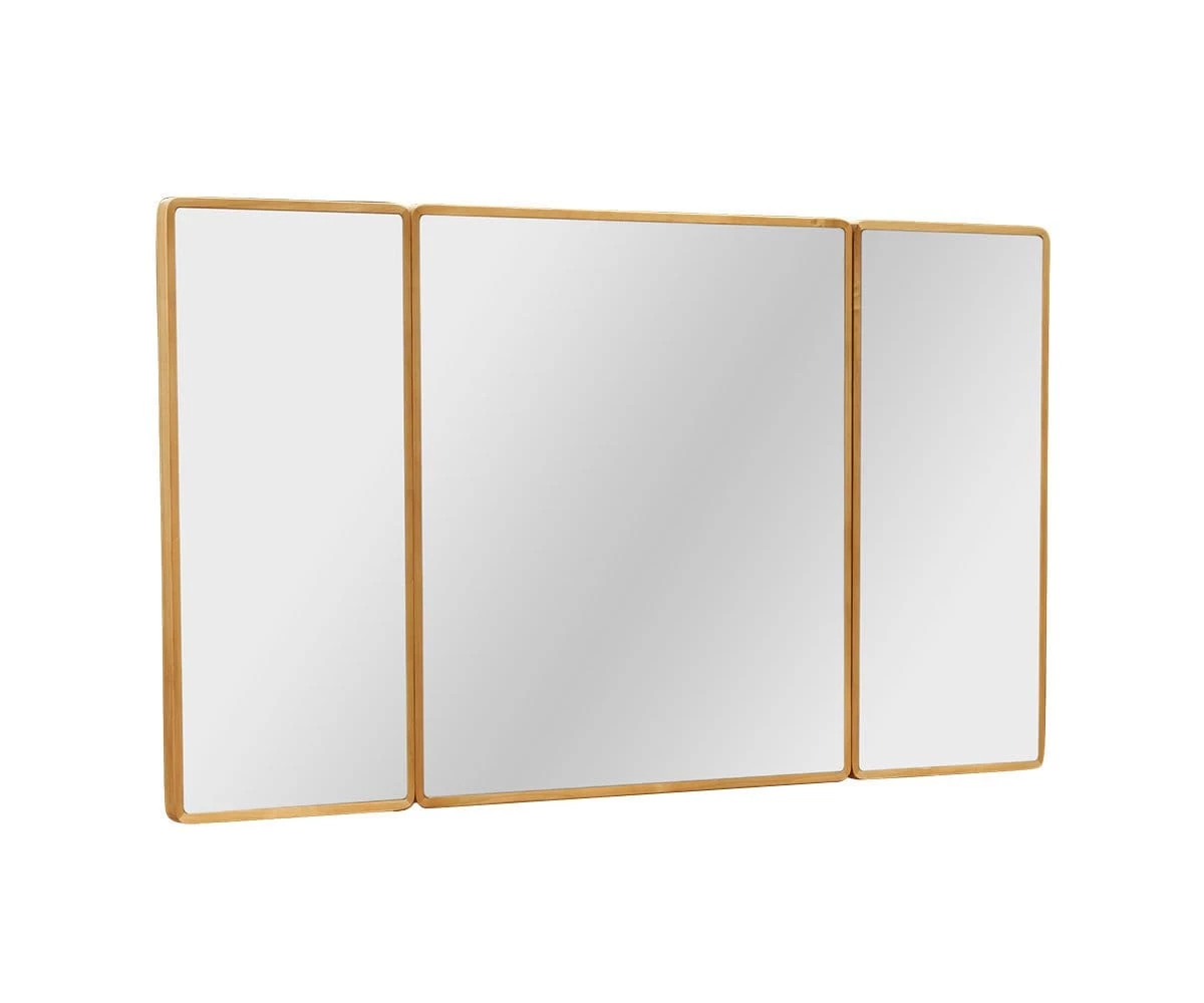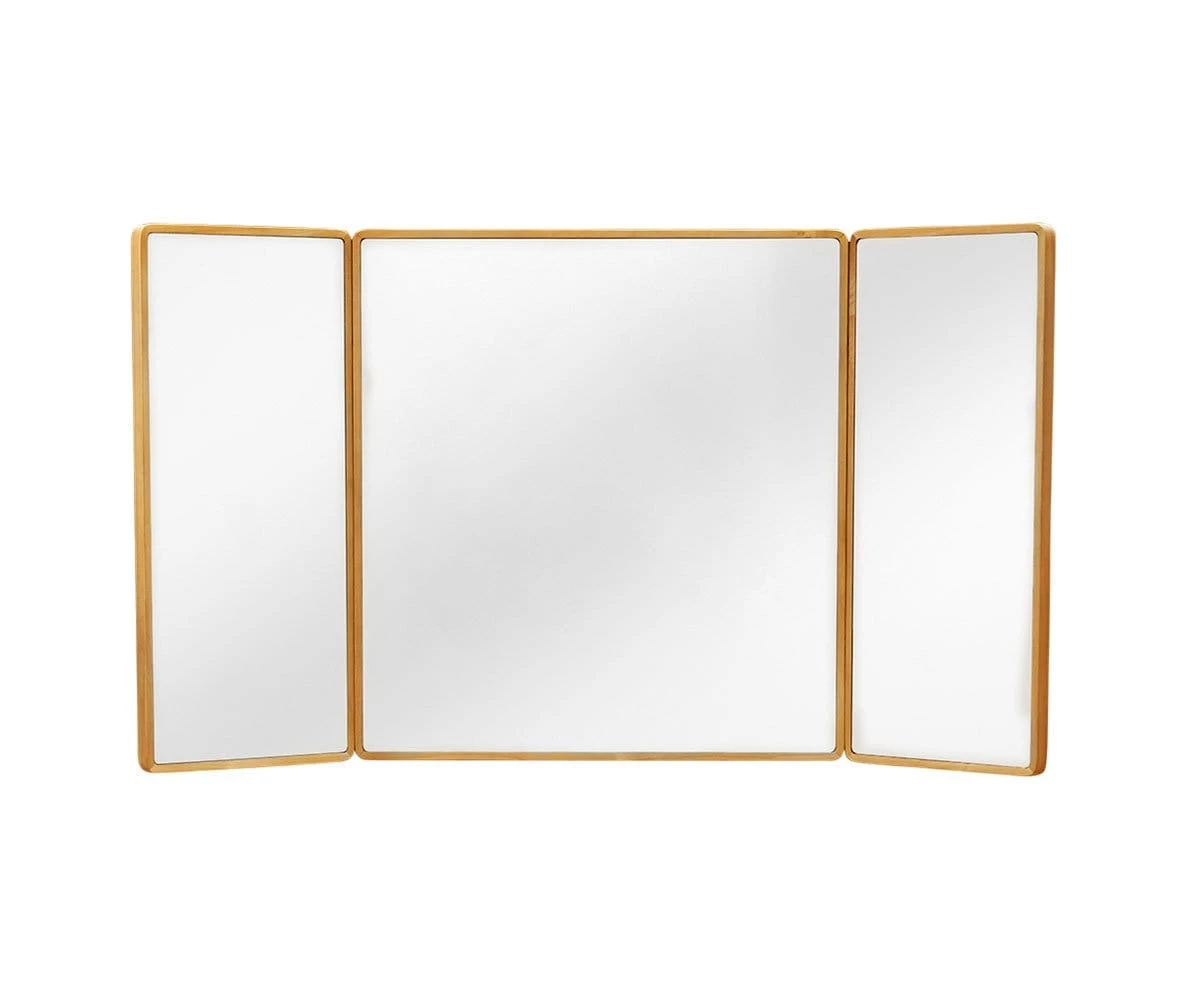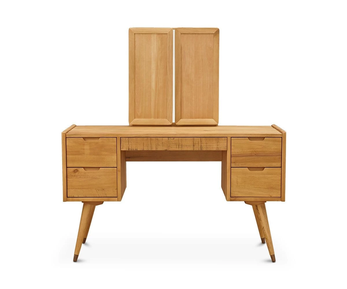 Simple Scandinavian character shines through in the Bolig Folding Vanity Mirror framed in solid American poplar with a distressed finish. Completed with rounded corners and covered back panels, this desktop/vanity top piece adds light and function to your space. The rustic reclaimed look of this collection is achieved through an intentional distressing technique that applies burn and saw marks to the surface while retaining and highlighting natural characteristics in the wood. This technique results in a reclaimed driftwood appearance, which adds personality and a one-of-a-kind uniqueness to each piece.