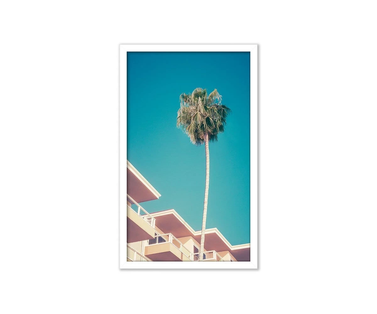 Let yourself be drawn towards thoughts of gently lapping waves, warm sand and a seemingly endless horizon. The Aquamarine Ascension print paints an inviting picture of beach-side life, complete with clear blue skies, a lush palm tree and charming beach-front condos.
