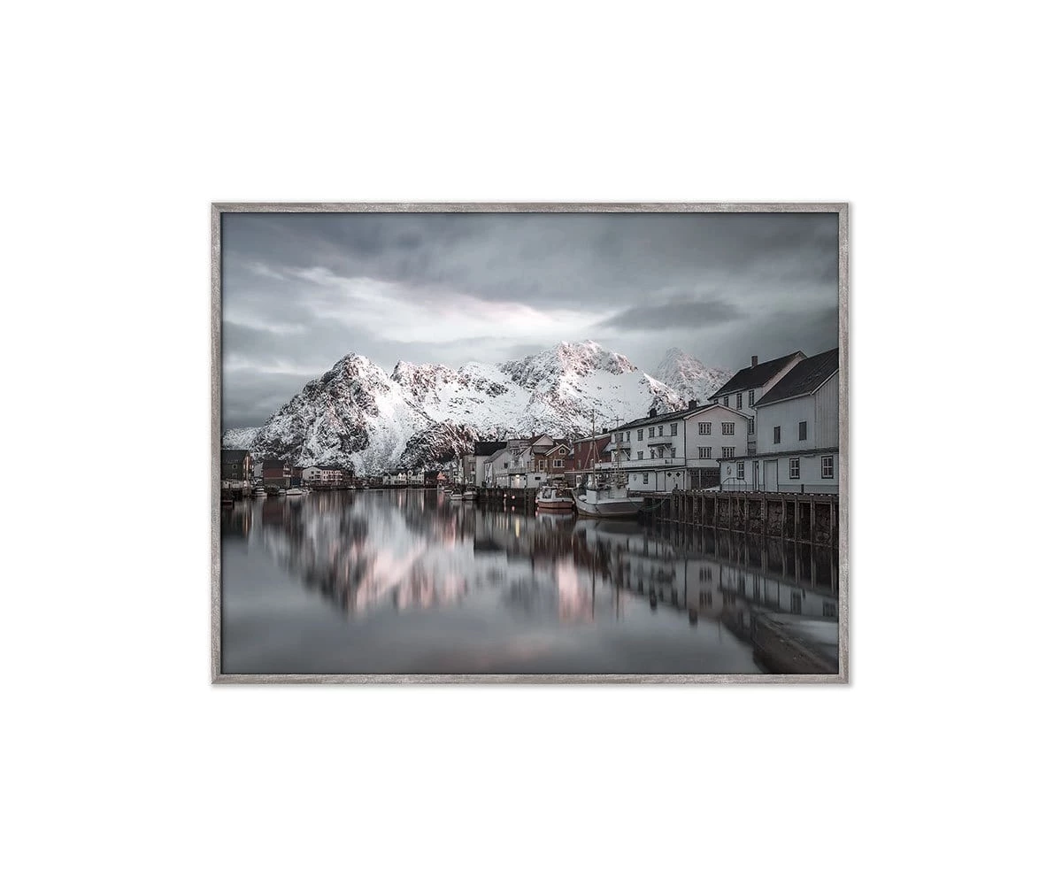 Majestic Epiphany depicts a quaint Nordic fishing town set in the lee of a snow-blanketed mountain range. This framed piece fills any room with a sense of serenity; glassy water reflects a still town and docked boats, while cool grey clouds drift lazily across the sky. Add this piece to your space to evoke thoughts of wintery Scandinavian charm.